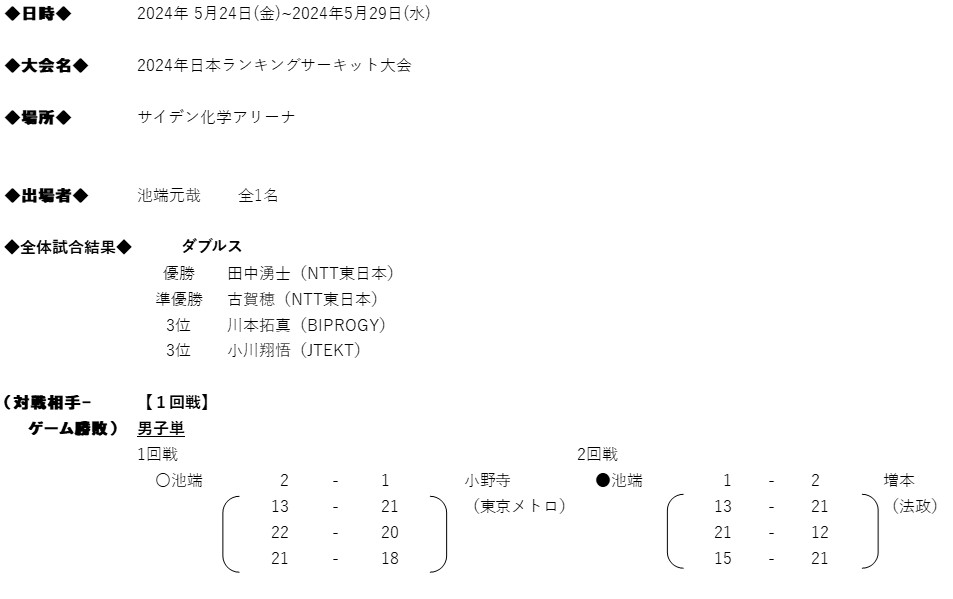 【試合結果】2024年日本ランキングサーキット大会【男子】