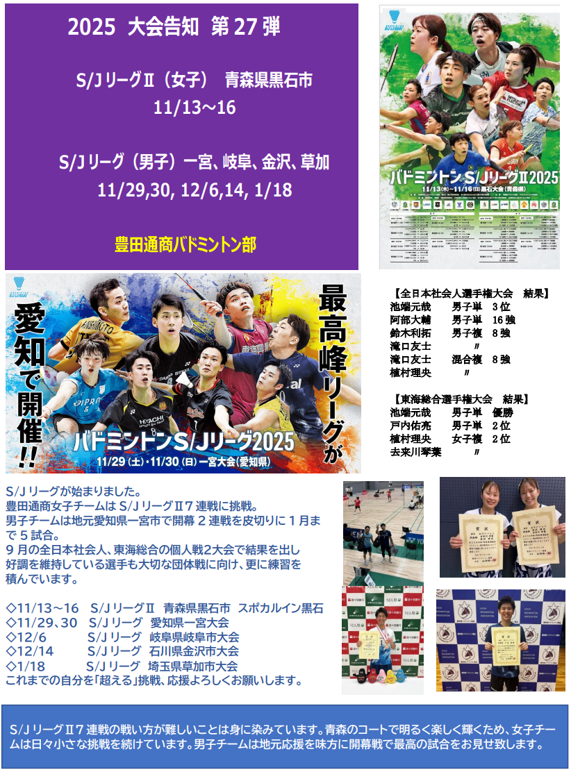 2025 大会告知 第27弾 S/J リーグⅡ(女子)、S/J リーグ(男子)