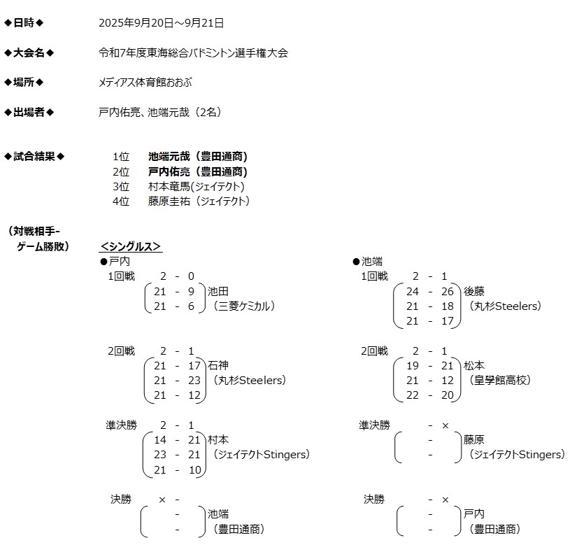 >【試合結果】令和7年度東海総合バドミントン選手権大会【男子単】
