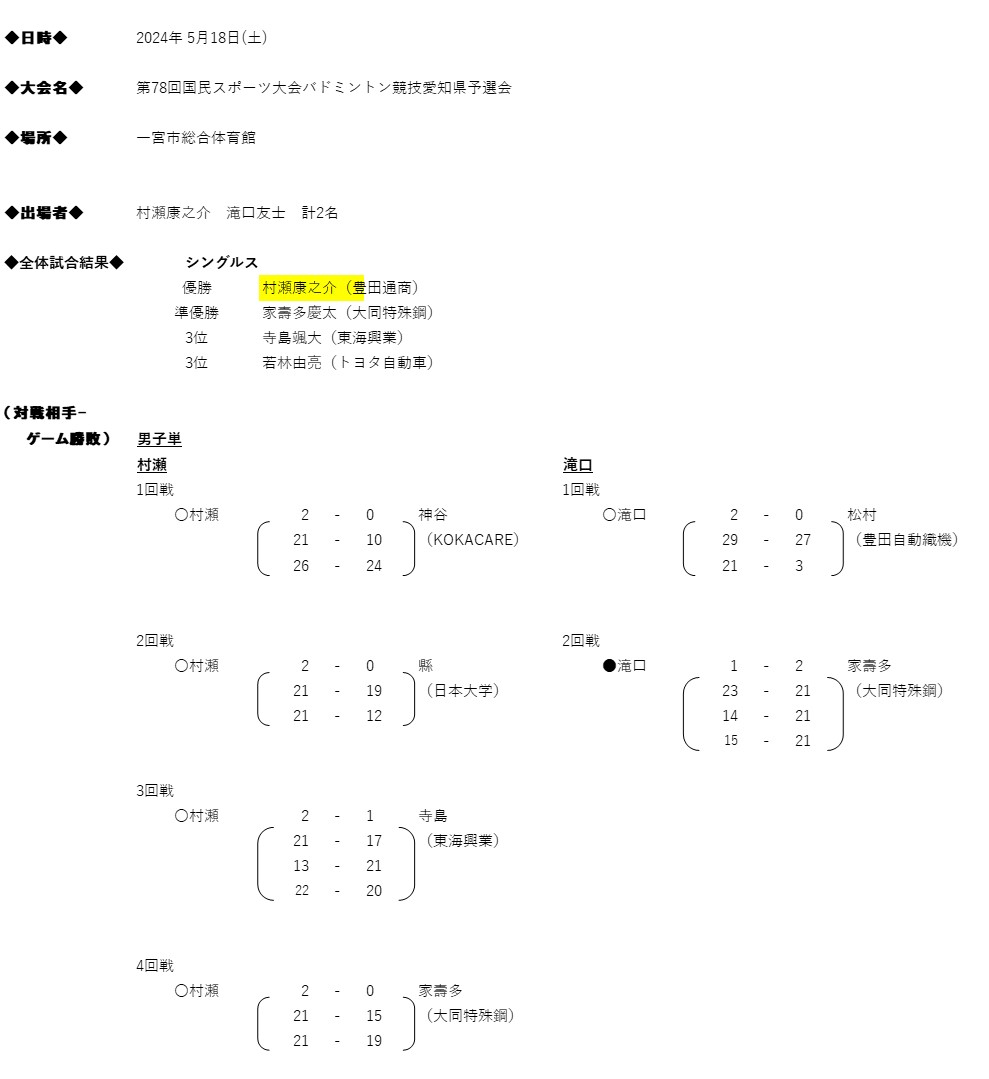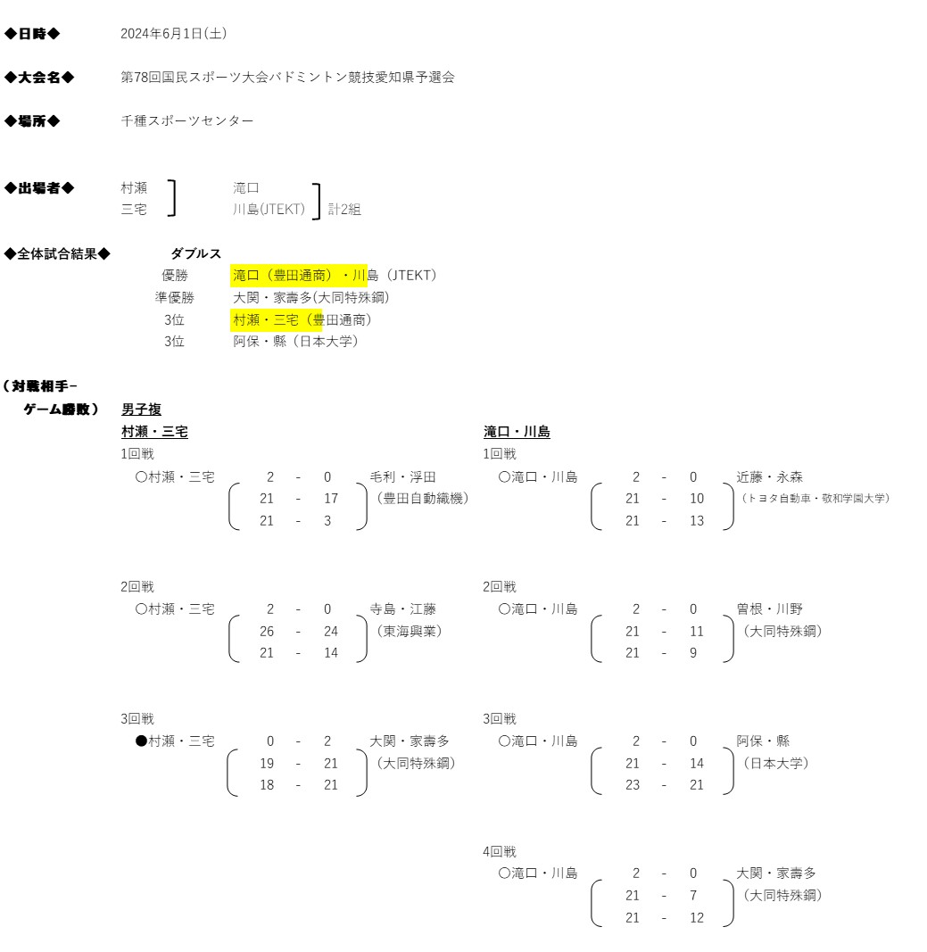 【試合結果】第78回国民スポーツ大会バドミントン競技愛知県予選会【男子】